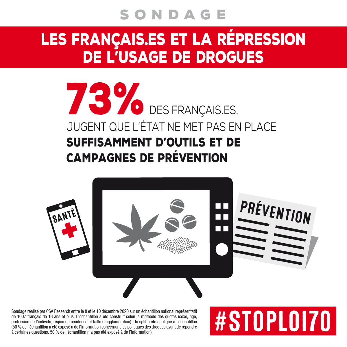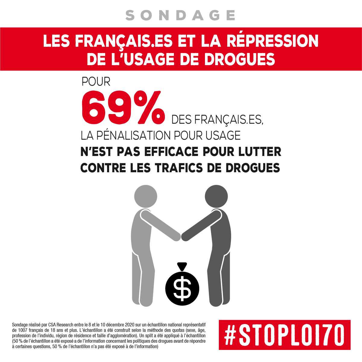 Un demi-siècle après la promulgation de la loi instaurant la pénalisation de l’usage de drogues en France, dite loi de 1970, la France continue de mettre en œuvre une politique des drogues axée sur la répression. Si une consultation citoyenne sur l’usage de cannabis dit « récréatif » est un pas en avant, les prises de position du ministère de l’Intérieur et du gouvernement restent aujourd’hui en faveur du « tout répressif ». Pour savoir ce que les Français-es pensent de ces politiques, nos organisations, membres du Collectif pour une Nouvelle Politique des Drogues (CNPD), ont commandé un sondage à l’institut CSA. Les résultats sont éloquents : l’opinion publique juge inefficaces les politiques répressives aujourd’hui en place et souhaite largement l’ouverture d’un débat sur les politiques des drogues.